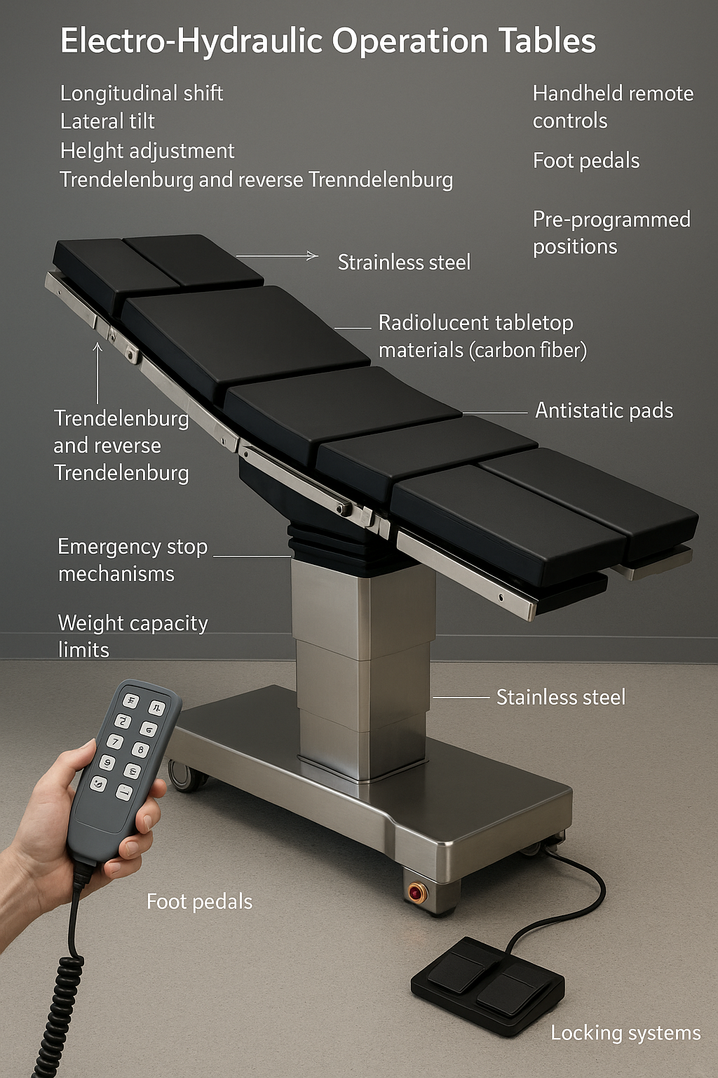 Elektrohydraulické stoly s přizpůsobitelným polstrováním a modulárním příslušenstvím dále zvyšují komfort. U bariatrických nebo ortopedických operací zajišťuje možnost nastavení opěrek nohou a rukou lepší péči o pacienta.