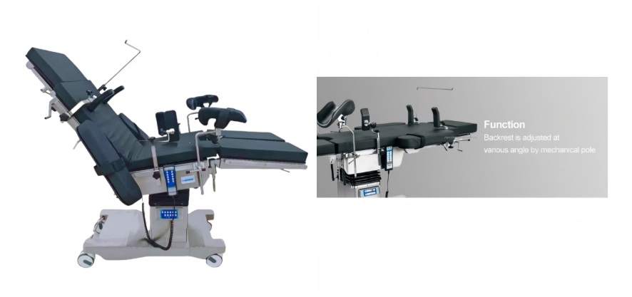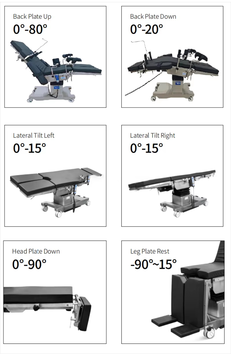 Stůl je rozdělen do čtyř částí: hlava, záda (včetně pasu), boky a nohy. Deska stolu je vyrobena z vysoce pevného kompozitního materiálu s rentgenovým přenosem; Při fotografování lze spolupracovat s C-ramenem.