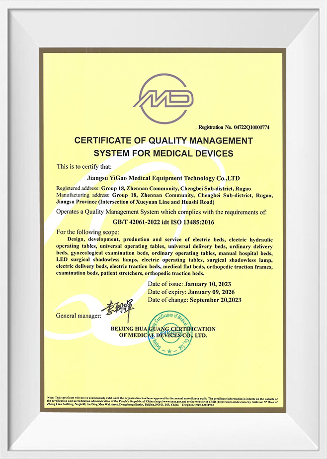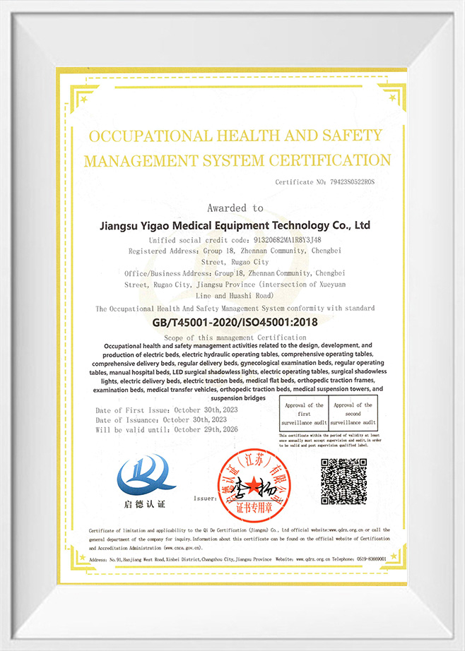 Jako podnik, který prošel ISO 9001, ISO 13485, ISO 14001, ISO 45001 a další certifikace systému managementu, Jiangsu Yigao Medical Equipment Technology Co., Ltd. považuje kvalitu produktů za svou životní mízu. Naše operační stoly přísně dodržují CE normy , což znamená, že splňují nejen bezpečnostní, zdravotní a ekologické požadavky evropského trhu, ale také představují mezinárodní vedoucí úroveň v designu a výrobě produktů.